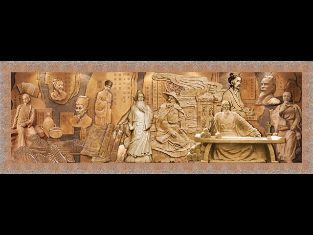 這個銅浮雕墻是為安徽金馬藥業(yè)設(shè)計的大門墻壁裝飾浮雕設(shè)計方案。以我國歷史上著名的醫(yī)者人物為主要雕刻對象,配以古文字、圖案、書卷等古代物品突出了醫(yī)藥的主題并彰顯了公司的歷史文化和傳統(tǒng)。