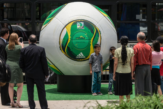 北京時(shí)間12月4日,2013年巴西聯(lián)合會(huì)杯用球CAFUSA雕塑亮相巴西圣保羅街頭。巴西市民紛紛與之合影留念。圖為兒童與雕像合影。